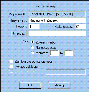 Aby utworzyć nową grę, należy wejść w Tryb Wieloosobowy --> Wyścig (Multiplayer --> Level Racing), a następnie wybrać typ połączenia. Zawsze wybieraj ostatnią opcję - połączenie TCP/IP dla Direct Play. Następnie kliknij OK, po czym zostaniesz przeniesiony do innej tabelki. Wybierz górny przycisk - Tworzenie Nowej Sesji.